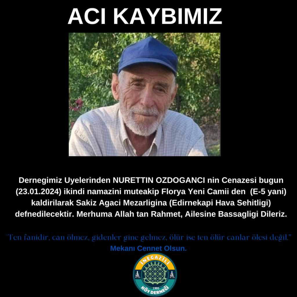 Derneğimiz Üyelerinden NURETTIN ÖZDOGANCI’nın Cenazesi bugün (23.01.2024) ikindi namazını müteakip Florya Yeni Camii den (E-5 yani) kaldırılarak Sekiz Ağacı Mezarlığına (Edirnekapı Hava Şehitliği) defnedilecektir. Merhuma Allah tan Rahmet, Ailesine Bassagligi Dileriz.