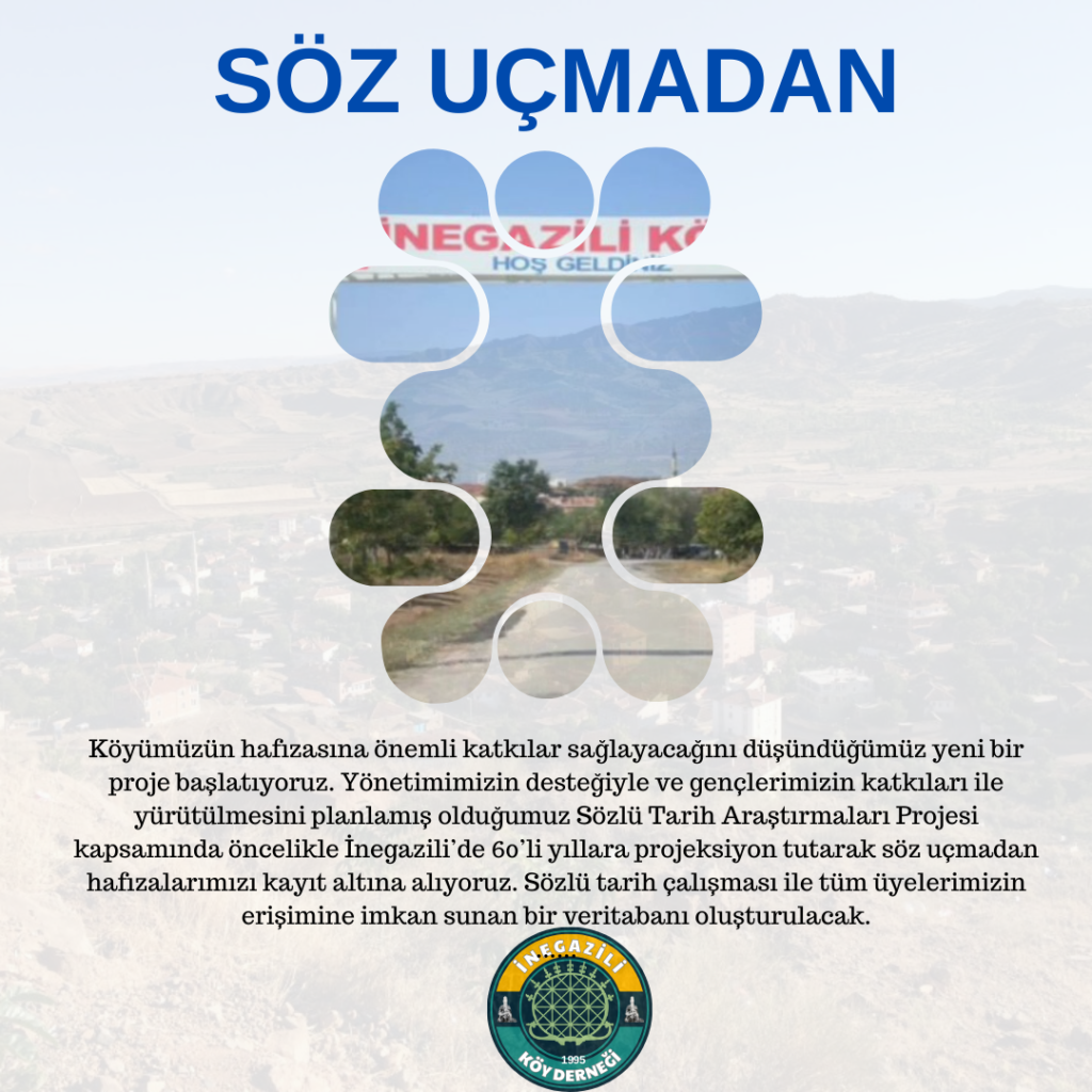 Köyümüzün hafızasına önemli katkılar sağlayacağını düşündüğümüz yeni bir projeye start veriyoruz. Yönetimimizin desteği ve gençlerimizin katkıları ile yürütülmesi planlanan Sözlü Tarih Araştırmaları (Söz Uçmadan) kapsamında köyümüzün 1950/60 yıllarına projeksiyon tutarak hafızamızı kayıt altına almayı planlamaktayız. Çalışmamızın sonunda derlemiş olunan bilgiler görsel ve yazılı olarak bir veri tabanına aktarılarak dernek üyelerimizin ve araştırmacıların kullanımına iznine sunulacaktır.